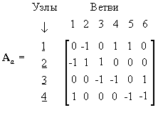 Для мостовой цепи, направленный граф которой представлен на рис. 1.8, б, матрица соединений Aa имеет q = 4 строки и p = 6 столбцов: