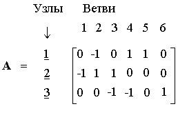 Матрица соединений A показывает, к какому узлу присоединены ветви направленного графа цепи. Если элемент матрицы ajk = + 1, то это означает, что k-я ветвь присоединена к j-му узлу и направлена от него; ajk = – 1 имеем для ветви k, присоединенной к j-му узлу и направленной к нему; ajk = 0 имеем для k-й ветви, не присоединенной к узлу j.