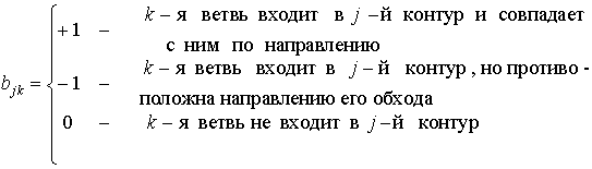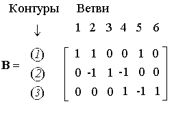 Матрица контуров B содержит информацию о том, в какие контуры цепи входят ветви. Здесь используют тот же принцип записи, что и для матрицы A: строки B-матрицы отвечают отдельным контурам цепи, столбцы ветвям: