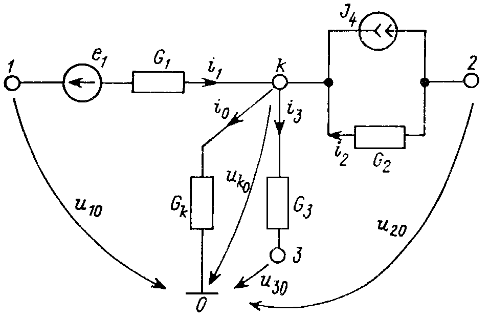 Для вывода узлового уравнения рассмотрим k-й узел цепи (рис. 3.1), соединенный с узлами 0, 1 – 3 ветвями, содержащими проводимости G = 1/R, источники ЭДС и тока.