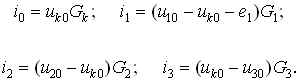 Выразим токи в ветвях, присоединенных к узлу, через узловые напряжения u10, u20, u30 и проводимости ветвей G: