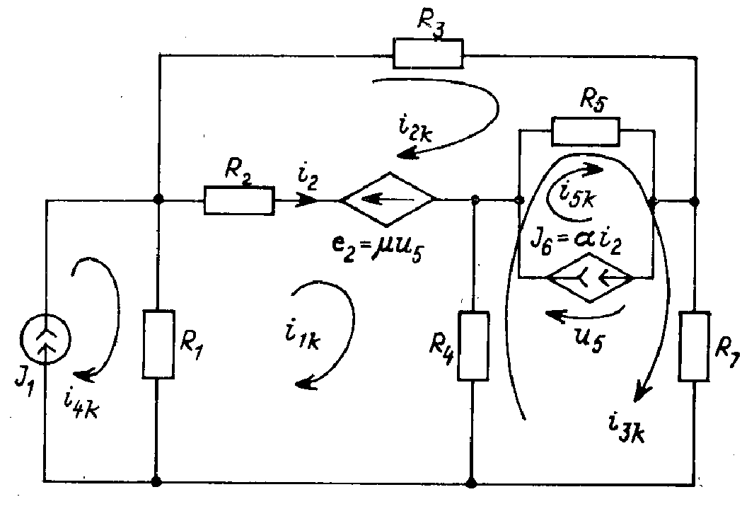 Управляющие величины и токи идеальных источников выражаем через искомые контурные токи следующим образом: i2 = i1к – i2к; i1к = J1; i5 = J6 = a(i1к – i2к); u5 = R5i5 = R5(i2к – i3к – i5к) = R5(i2к – i3к – a(i1к – i2к)).