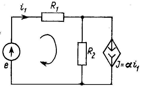 В активных цепях это условие в общем случае не соблюдается. Покажем это на примере простейшей цепи (рис. 4.5). Ее единственное контурное уравнение записывается в форме: (R1 + R2) i1 - R2J = e, или (R1+ (1 - a)R2) i1 = e. Если коэффициент усиления усилителя тока составляет a = (R1+ R2)/R2 то множитель при i1 равен нулю, и уравнение не имеет решения. |