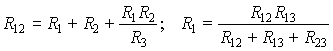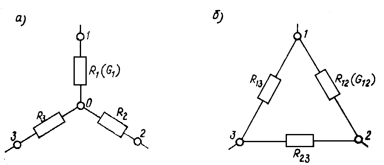 Преобразования звезды (рис. 4.5, а) в эквивалентный треугольник (рис. 4.5, б) и наоборот определяются формулами для сопротивлений