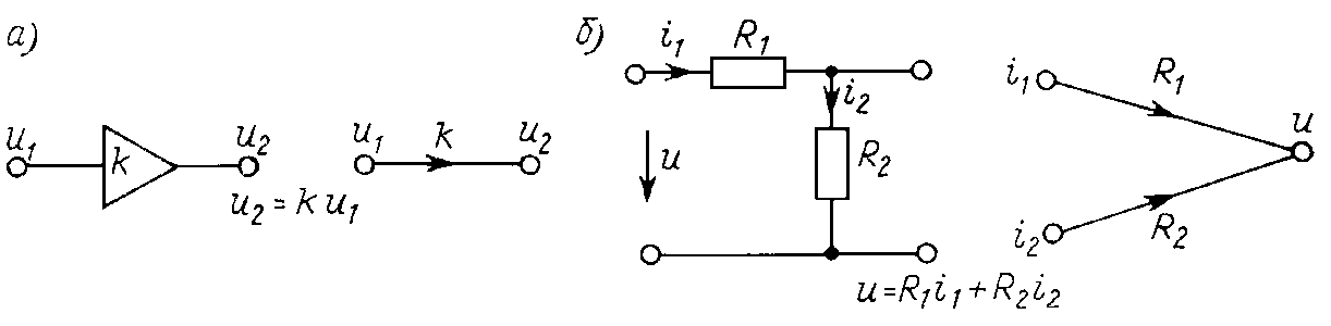 Наряду с алгебраическими уравнениями (Кирхгофа, узловыми или контурными) при исследовании цепей применяют эквивалентную им графическую форму изображения связей между переменными (токами и напряжениями) — сигнальный граф цепи, который строят из двух типов элементов — точек, называемых узлами, и соединяющих их линий со стрелками — ветвей графа. Узлам отвечают переменные (токи, напряжения и ЭДС), ветвям — количественные соотношения между ними. Каждой ветви сигнального графа приписывают коэффициент передачи (передачу) — множитель, указывающий величину, на которую умножается переменная, передаваемая по ветви от одного узла к другому в направлении стрелки. Связи между переменными выражены в форме x2 = t12x1, где x1,2 — напряжение, ток или ЭДС, а t12 — сопротивление R, проводимость G или безразмерный коэффициент k. Сигнал, отвечающий узлу, к которому подходит несколько стрелок, равен сумме входящих в узел сигналов, умноженных на коэффициенты передачи соответствующих ветвей. Связь между входным и входным напряжениями усилителя u1 и u2 показана на рис. 5.1, а.
