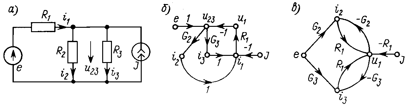 Узлы, соответствующие отдельным переменным, можно разместить произвольно на графе, однако лучше располагать ближе друг к другу те, что связаны уравнениями системы. Ветви графа отвечают отдельным слагаемым правых частей уравнений (рис. 5.2, б). Согласно первому уравнению, в узел i1 входят три ветви. Передачи ветвей, соединяющих узлы i2 и i3 с узлом i1, равны единице, ветвь J ® i1 имеет передачу (-1). Аналогично на графе изображают и остальные уравнения системы.