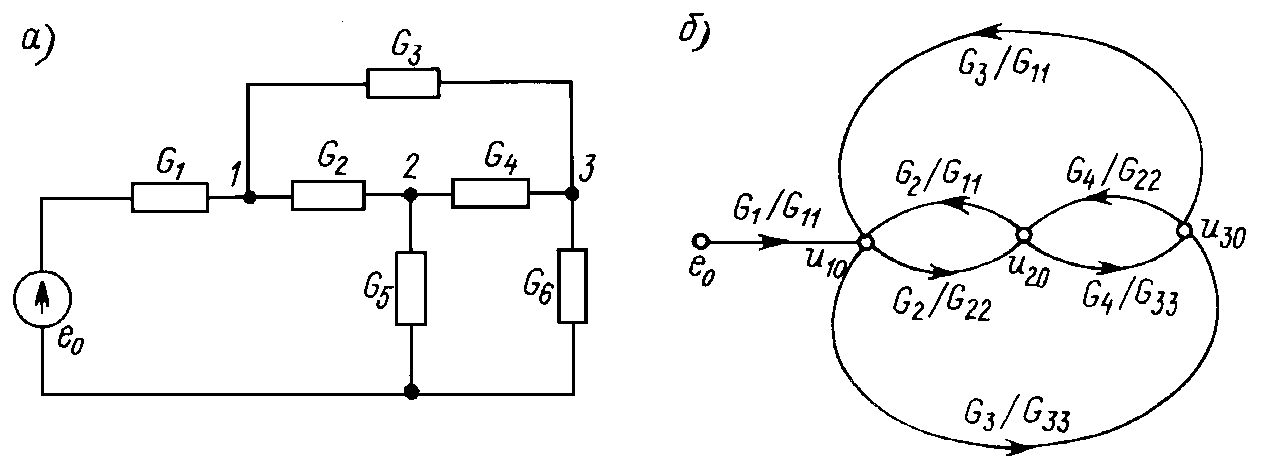 Сигнальный граф на основе узловых уравнений можно построить без составления самих уравнений. Выделим узлы графа, отвечающие узловым напряжениям, источникам ЭДС и тока. Узлы графа, соответствующие напряжениям узлов цепи, соединенных общими ветвями, на графе соединяют парами ветвей, передачи которых равны проводимостям общих ветвей, деленным на собственную проводимость узла, к которому направлена ветвь графа. Источники в ветвях, подключенных к данному узлу цепи, учитывают на графе ветвями, направленными к узлу графа от соответствующего истока. Для истока, отвечающего источнику ЭДС и направленного к узлу цепи, передача ветви графа равна проводимости ветви с источником, деленной на собственную проводимость узла. Если источник направлен от узла цепи, то передача ветви графа такая же, но имеет знак “минус”. Передача ветви от узла графа, отвечающего источнику тока, равна величине, обратной собственной проводимости узла. Ее знак определяется направлением источника по правилам формирования правых частей узловых уравнений: для источника, направленного к данному узлу цепи, берем знак “плюс”, при его противоположном направлении — “минус”.