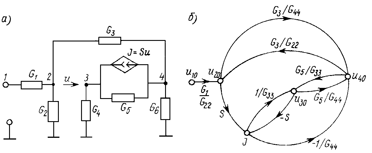 Особенно просто строится сигнальный граф для схем с идеальными усилителями напряжения. Здесь нет необходимости выражать управляющие величины через переменные графа, так как входные напряжения усилителей непосредственно выражаются через узловые напряжения.