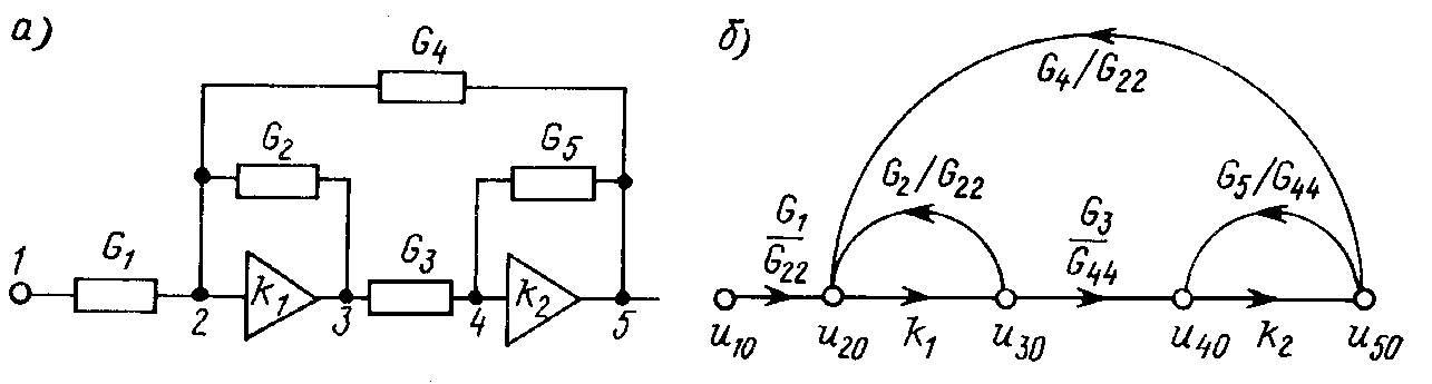 На графе (рис. 5.6, б) каждой из проводимостей цепи отвечает лишь одна ветвь, а не две, как в пассивной цепи на рис. 5.4, а,б, так как напряжения выходных узлов усилителей определяются соотношениями uвых = kuвх. Поэтому к каждому из их выходных узлов подходит одна ветвь графа, выражающая последнее соотношение. Это же можно трактовать иначе. Проводимости 2, 4 и 5 передают сигнал только в одну сторону — по цепи обратной связи — с выхода усилителя к соответствующей точке цепи. Видно, что структура построенного графа повторяет структуру цепи.