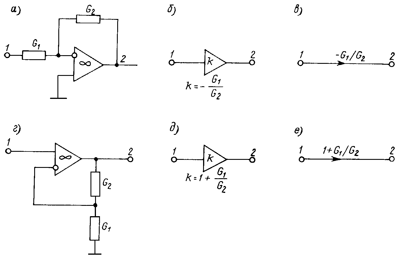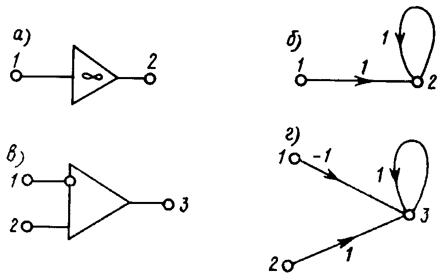 Наиболее распространенные схемы включения усилителя с обратными связями рис. 5.8, а,г эквивалентны усилителям с конечными коэффициентом усиления (рис. 5.8, б,д), и поэтому их можно изобразить на графе, как показано на рис. 5.8, в,е.