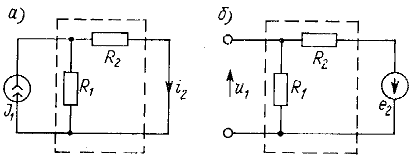 Полученная связь также обусловлена симметрией контурных уравнений пассивных цепей. Проиллюстрируем ее на простейшем примере Г-образного четырехполюсника (рис. 6.6 а,б).