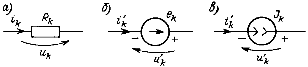 В последнем равенстве должно быть принято согласованное направление отсчета напряжений uk и токов ik на резистивных элементах (рис. 6.12, а). Направления напряжения на источниках отсчитываются от положительного зажима к отрицательному (рис. 6.12, б,в), направления токов источников ik' — от отрицательного зажима к положительному (в направлении стрелки).