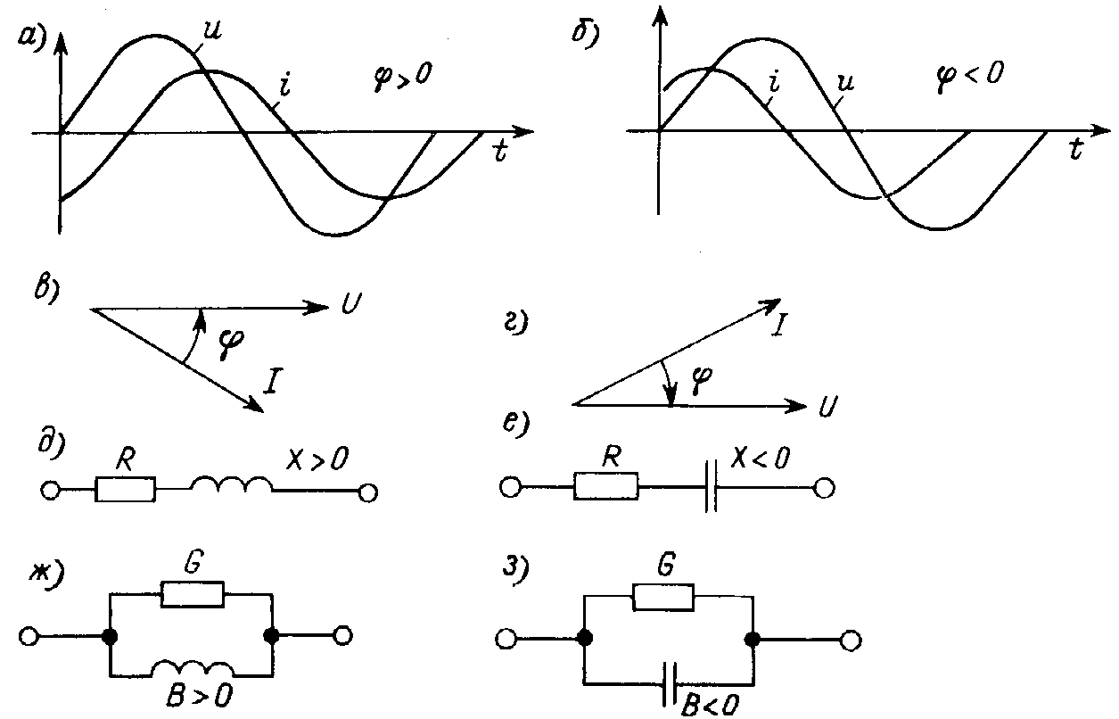 Если j < 0, напряжение отстает от тока (рис. 7.5, б,г), X < 0, цепь имеет емкостной характер и приводится к схеме замещения (рис. 7.5, е).