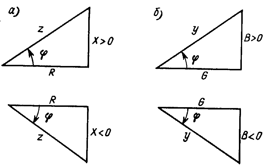 Активное R и реактивное X сопротивления двухполюсника можно изобразить в виде треугольника, гипотенузой которого является полное сопротивление z (рис. 7.6, а). Аналогичным образом связаны проводимости G, B и y (рис. 7.6, б).