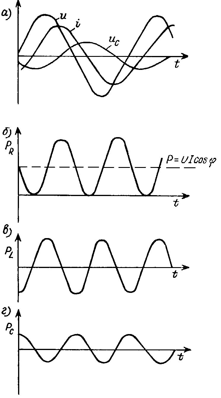 При емкостном характере цепи, наоборот, максимальная энергия, запасаемая конденсатором, превосходит максимальную энергию катушки, и отдача энергии источнику в течение части периода обеспечивается конденсатором. В этом случае амплитуда колебаний мгновенной мощности pC превосходит амплитуду колебаний мощности pL.