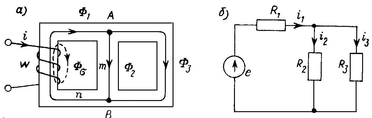 Определение параметров подобных цепей требует анализа пространственного распределения магнитного поля, в общем случае проводимого методами теории электромагнитного поля. Однако в простейших случаях, в первую очередь, для обмоток на общих сердечниках, возможно упрощенное описание этого явления, основанное на приближенном представлении картины магнитного поля, которое принимается локализованным в объеме сердечника. В этом приближении связи между магнитными потоками в стержнях сердечника и вызывающими их токами могут быть описаны с помощью интегральных параметров магнитных цепей. Магнитные цепи — системы с сердечниками, магнитные потоки в стержнях которых создаются токами, протекающими в обмотках, расположенных на этих стержнях (рис. 9.1, а).