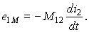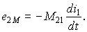 Связи между токами и напряжениями индуктивно связанных обмоток (рис. 9.2). Взаимное влияние индуктивно связанных обмоток проявляется в том, что при изменении тока i1 создаваемый им поток ΦM индуктирует ЭДС взаимоиндукции e2M = – dΨ2M/dt, где Ψ2M = w2ΦM — потокосцепление взаимоиндукции. Предполагая связь Ψ2M = M21i1 между потокосцеплением и вызывающим его током i1 линейной (взаимная индуктивность M21 = const), запишем выражение для ЭДС взаимоиндукции e2M в виде