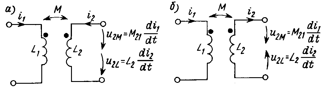 Точки, отмечающие один из зажимов каждой катушки, имеют следующий смысл: при положительном направлении тока в первой катушке (от точки) составляющая напряжения u2M = M21 di1/dt, обусловленная взаимной индукцией, во второй катушке имеет положительное направление также от точки. Записанные выше соотношения для напряжения будут справедливы для схемы, изображенной на рис. 9.3, а либо при направлении токов в обеих катушках сверху вниз, либо снизу вверх. Маркировка зажимов катушек точками не предопределяет выбора положительных направлений токов в катушках. Так, при выборе других положительных направлений токов в тех же катушках (рис. 9.3, б) теперь запишем: