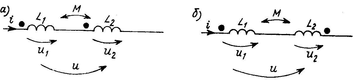 Для анализа последовательного соединения двух связанных катушек используем уравнения Кирхгофа. При этом маркированные зажимы последовательно включенных катушек могут быть соединены по-разному. Суммарное напряжение согласно включенных катушек (рис. 9.4, а) равно