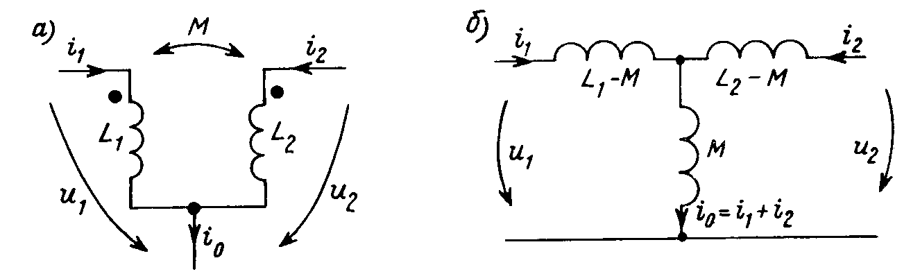 Если две индуктивно связанные катушки (рис. 9.5, а) имеют общую точку (пусть, например, их немаркированные зажимы соединены друг с другом), то, переписав соотношения для напряжений (9.1) в форме: