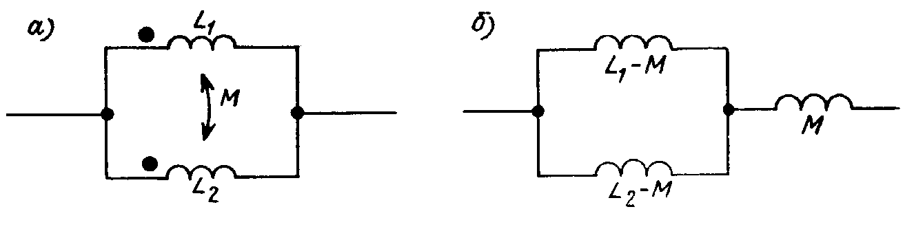 Для определения эквивалентной индуктивности параллельно соединенных катушек (рис. 9.6, а), преобразуем эту схему в изображенную на рис. 9.6, б. Поскольку индуктивности при последовательном и параллельном соединениях суммируются по тем же правилам, что и сопротивления, для эквивалентной индуктивности параллельного соединения имеем: