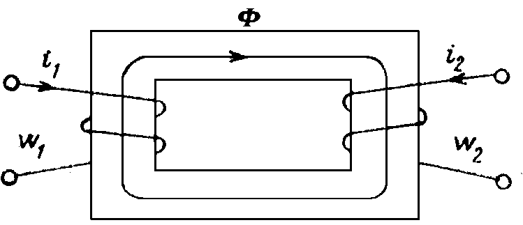 весь поток, создаваемый одной обмоткой, пересекает сечение витков второй обмотки. К этому режиму можно приблизиться, помещая обе обмотки на общем сердечнике (рис. 9.7), материал которой имеет высокую магнитную проницаемость, либо располагая их витки бесконечно близко друг к другу. При указанных приближениях получим для индуктивности |