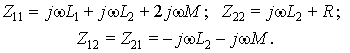 При записи общего сопротивления двух контуров учитывается их взаимное индуктивное влияние друг на друга. Здесь член jωM имеет знак “плюс”, если положительные направления обоих контурных токов ориентированы одинаково относительно маркированных зажимов катушек, и оба тока протекают по ним либо в положительном, либо в отрицательном направлении. Если же один из влияющих друг на друга токов протекает в положительном, а другой – в отрицательном направлении, в общем сопротивлении контуров учитывают член – jωM. С учетом сформулированных правил получим для контурных сопротивлений цепи (см. рис. 9.8):