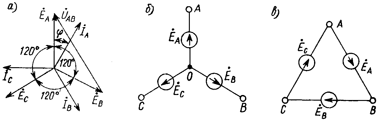 — соединение звездой (рис. 10.1, б). Поскольку сумма фазных ЭДС симметричной системы
