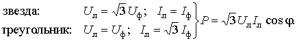 Активная мощность, потребляемая симметричной трехфазной системой, суммируется из мощностей, потребляемых фазами: P = 3UфIф cos φ (φ — угол сдвига между фазными токами и напряжениями). Используя соотношения для линейных величин, запишем для активной мощности симметричной трехфазной системы