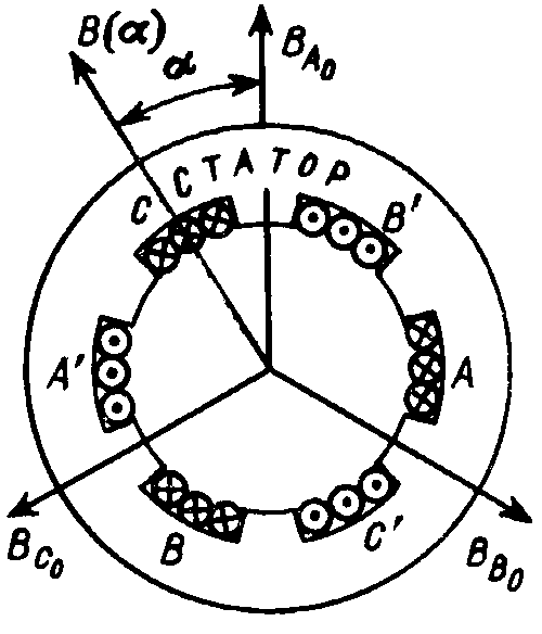 где BA0 — максимальное значение индукции, достигаемое на оси обмотки. Учитывая пространственное расположение обмоток всех трех фаз на статоре, для результирующего значения индукции, используя принцип наложения, получим