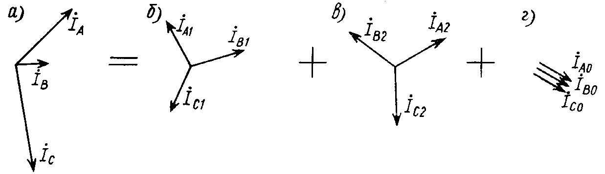 Наконец, система составляющих нулевой последовательности İA0, İB0, İC0 включает три одинаковых вектора, совпадающих по фазе (рис. 10.7, г).