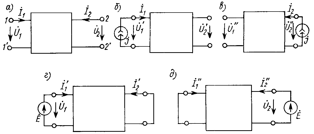 Теория четырехполюсников устанавливает общие связи между их входными и выходными токами и напряжениями (рис. 12.1, а). При работе четырехполюсника предполагается равенство токов обоих входных зажимов 1, 1' и пары выходных зажимов 2, 2'.