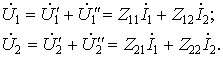 Применяя принцип наложения, получим связи между входными и выходными величинами для общего случая — уравнения четырехполюсника через Z-параметры (см. рис. 12.1, а):
