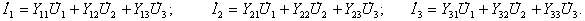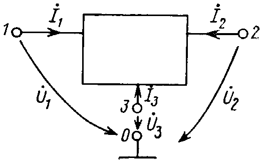 Для трехполюсных элементов цепи — трехполюсников (рис. 12.16), к которым относятся, например, транзисторы, система уравнений для токов имеет вид: