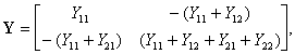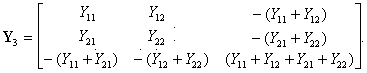 где Y11, Y12, Y21 и Y22 — элементы матрицы четырехполюсника с общим зажимом 3, входными 13 и выходными 23 зажимами.