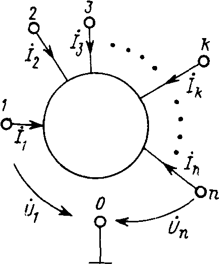 При описании электрической цепи ее зачастую представляют как совокупность фрагментов более общего вида (чем четырех- и двухполюсники), имеющих произвольное число внешних зажимов (полюсов), через которые такой фрагмент — многополюсник — соединяется с другими участками цепи (рис. 12.14).