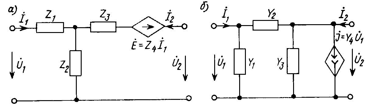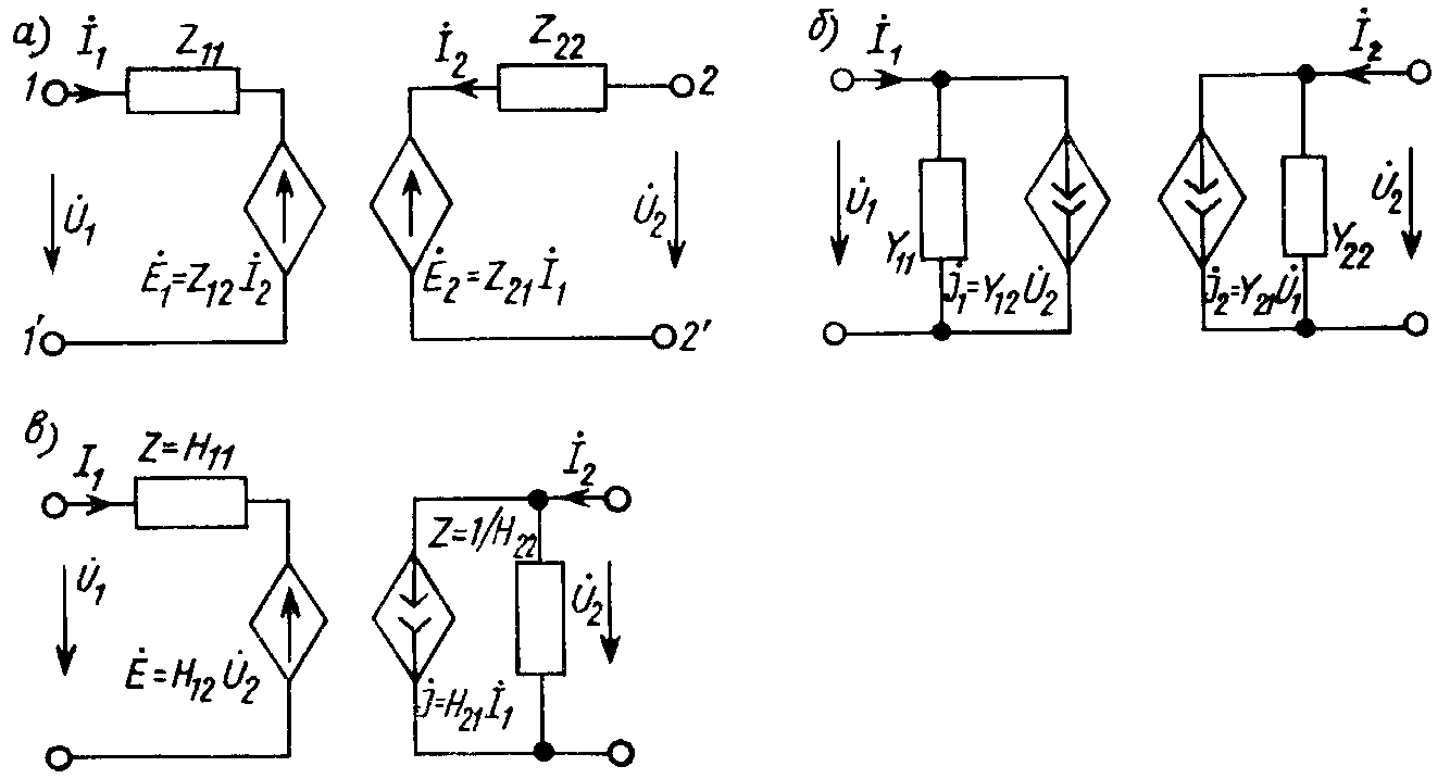 Эквивалентные схемы можно построить на основе уравнений четырехполюсника, записанных в Z-, Y- и H-формах. Поскольку четырехполюсник в общем случае описывается четырьмя независимыми параметрами, то каждая такая схема будет содержать четыре элемента. Так как Z-уравнения выражают напряжения на зажимах как сумму двух слагаемых, пропорциональных токам, то в схеме замещения имеем последовательное соединение сопротивлений и управляемых источников ЭДС (рис. 12.2, а).