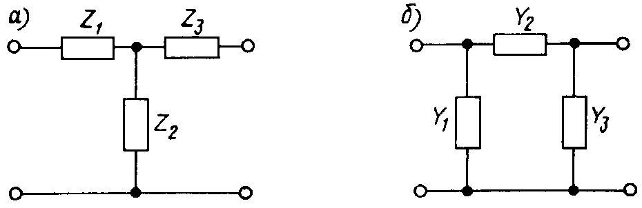 Для обратимых четырехполюсников, в частности, для четырехполюсников, не содержащих управляемых источников, т. е. состоящих только из пассивных элементов, соотношения между входными и выходными величинами удовлетворяют принципу взаимности, откуда для них следуют равенства Z12 = Z21; Y12 = Y21. Поэтому обратимый четырехполюсник характеризуется лишь тремя независимыми параметрами. A-параметры обратимого четырехполюсника связаны соотношением DA = A11A22 – A12A21 = 1, справедливость которого можно проверить, используя связи между A- и Z-параметрами (Приложение 1). Анализируя соотношения для параметров одногенераторных схем замещения (см. рис. 12.3, а, б), приходим к выводу, что в рассматриваемых условиях Z4 = 0; Y 4 = 0, — схемы замещения обратимых четырехполюсников не содержат управляемых источников (рис. 12.4, а, б).