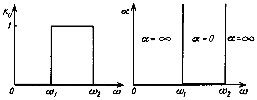 Электрическим фильтром называется четырехполюсник, предназначенный для передачи без искажений части спектра входного сигнала, лежащего в определенном диапазоне частот, полосе пропускания и подавления спектральных составляющих, лежащих в других частотных диапазонах, полосе задерживания. Идеальный фильтр должен обеспечивать в полосе пропускания значение коэффициента передачи KU = 1, (или коэффициента затухания a = 0), а в полосе задерживания передача должна отсутствовать, т. е. KU = 0 (a = ¥). Амплитудно-частотные характеристики идеального фильтра с полосой пропускания от w1 до w2 изображены на рис. 13.1.