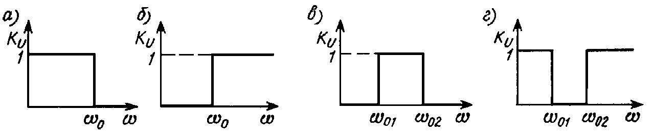 В зависимости от относительного расположения полос пропускания и задерживания, фильтры подразделяют на фильтры нижних частот (ФНЧ) (амплитудно-частотная характеристика рис. 13.2, а), фильтры верхних частот (ФВЧ) рис. 13.2, б, полосовые (ПФ) — рис. 13.2, в и заграждающие (ЗФ) рис. 13.2, г.