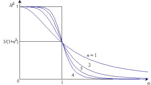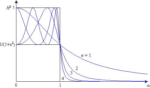 В полосе задерживания значение H(w) уменьшается тем быстрее, чем выше показатель степени полинома n. Заданная величина минимального ослабления в полосе задерживания amin выражается через введенные функции: amin = – 20 lg H(wз) = 10 lg [1 + w2Q2n(wз)], где wз граничная частота полосы пропускания. При заданных amin, e, wз и семействе функций Qn из последней связи можно определить степень n, обеспечивающую требуемый спад характеристики H(w) в полосе задерживания.