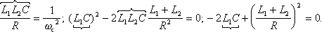 Подстановка членов во второе уравнение (показаны стрелками) позволяет найти значение wc(L1 + L2)/R = 2. Далее из последнего уравнения определяем L1C = 2/wc2. После подстановки этого значения в первое уравнение получим: wcL2 = R/2. Далее легко определим все остальные параметры из последних равенств: wcL1 = 3R/2; 1/(wcC) = 3R/4.