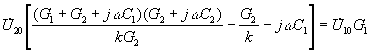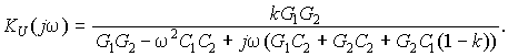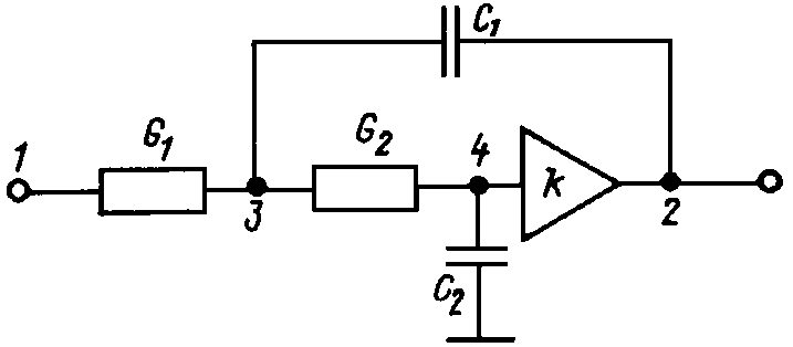 Для определения пяти параметров схемы: G1, G2, C1, C2 и k имеем лишь три уравнения. Это позволяет наложить дополнительные условия на параметры, например, G1 = G2 = 1/R; C1 = C2 = C. Тогда выражение передаточной функции примет вид