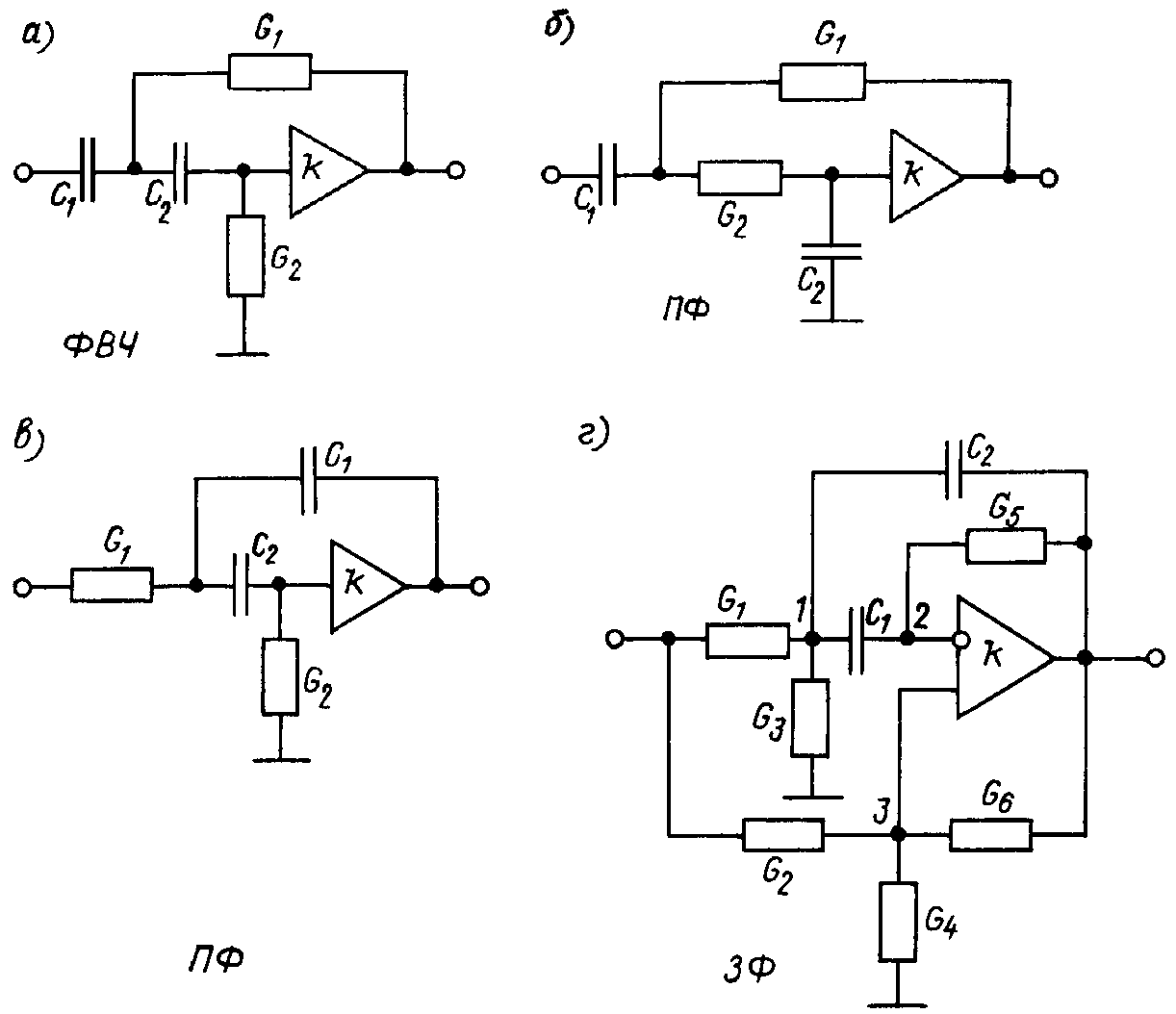 Активное звено заграждающего фильтра 2-го порядка должно иметь более сложную структуру и соответственно большее число элементов, чем рассмотренные схемы, так как ее передаточная функция в общем виде