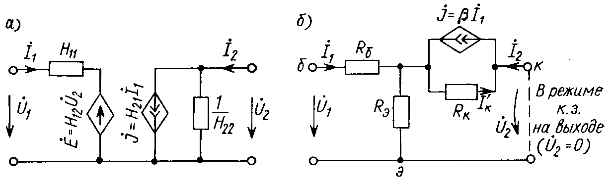 Для расчета малосигнального режима в электронной цепи, в котором рассматриваются только переменные составляющие токов и напряжений, используются схемы замещения транзистора. В области низких и средних частот описание транзистора системой гибридных уравнений приводит к резистивной схеме рис. 14.4, а. Распространена также одногенераторная схема (рис. 14.4, б). Параметры первой схемы непосредственно выражаются через H-параметры транзистора.