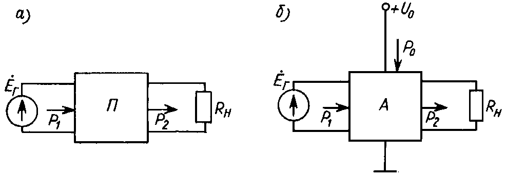 Одной из особенностей активных цепей является эффект усиления мощности, генерируемой независимыми источниками. Так, при питании сопротивления нагрузки Rн от источника Ėг через пассивный четырехполюсник (рис. 14.14, а) активная мощность на выходе четырехполюсника P2, потребляемая нагрузкой, не может превосходить мощность на входе четырехполюсника P1, отдаваемую источником: P2 £ P1. Понятно, что знак равенства имеет место лишь для четырехполюсника без потерь, состоящего из LC-элементов. Соотношения между мощностью на входе и выходе активного четырехполюсника, определяемой составляющими на частоте входного сигнала (рис. 14.14, б), могут быть любыми. Это не противоречит закону сохранения энергии, так как режим работы активных элементов, находящихся внутри четырехполюсника A, обеспечивается источником постоянного напряжения U0, от которого и потребляется дополнительная мощность P0. При рассмотрении энергетического баланса цепи в целом активная мощность, отдаваемая как независимыми, так и управляемыми источниками, равна сумме мощностей, потребляемых во всех резистивных элементах цепи. Заметим также, что усилительные устройства, используемые в системах переработки информации для усиления мощности, отличаются весьма низкой эффективностью преобразования энергии. Однако это не имеет большого значения, поскольку речь идет о небольших абсолютных значениях мощностей.