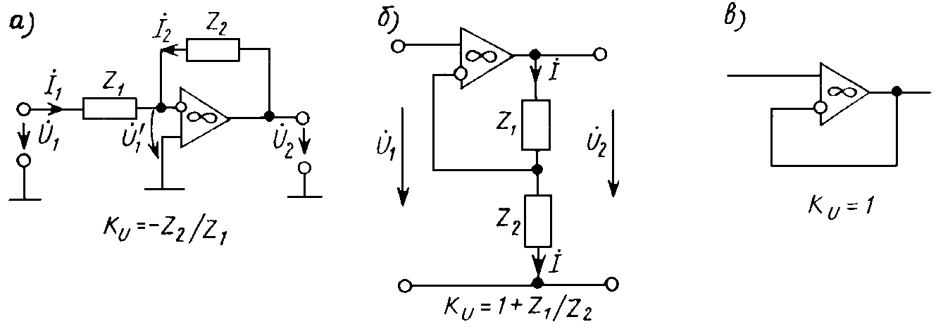 Обе рассмотренные схемы можно использовать в качестве усилителя с конечным значением KU. Отрицательное значение KU дает схема на рис. 14.16, а, положительное на рис. 14.16, б. При Z1 = 0 эта схема представляет собой повторитель напряжения (рис. 14.16, в).