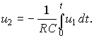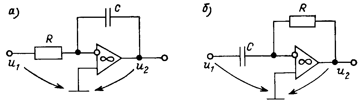 Поскольку оператор 1/jw соответствует во временной области интегрированию, то такая цепь осуществляет интегрирование входного напряжения. Действительно, при идеальном операционном усилителе ток i в цепи обратной связи равен i = C du2/dt, так как напряжение входного узла усилителя u = 0. С другой стороны, этот же ток протекает во входной ветви i = – u1/R. Сопоставление обоих выражений для тока приводит к равенству: