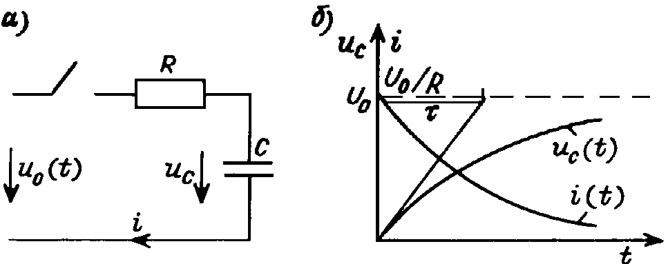 При анализе подключения RC-цепи к источнику напряжения u0(t) (рис. 15.1, а), согласно сказанному выше, из уравнений, составленных для цепи после коммутации,