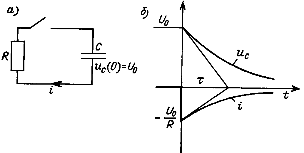 Соответствующие кривые изображены на рис. 15.2, б. Напряжение на конденсаторе непрерывно в момент коммутации и уменьшается по экспоненциальному закону от начального значения U0. Скорость протекания разряда определяется постоянной времени t = RC.